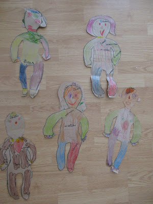 decidimos fazer um corpo grande com esqueleto e alguns orgãos...mas todos queriam fazer um. Então contornamos o boneco da casinha das bonecas e fizemos vários pequenos. cada um desenhou o que achou que o corpo tinha por dentro