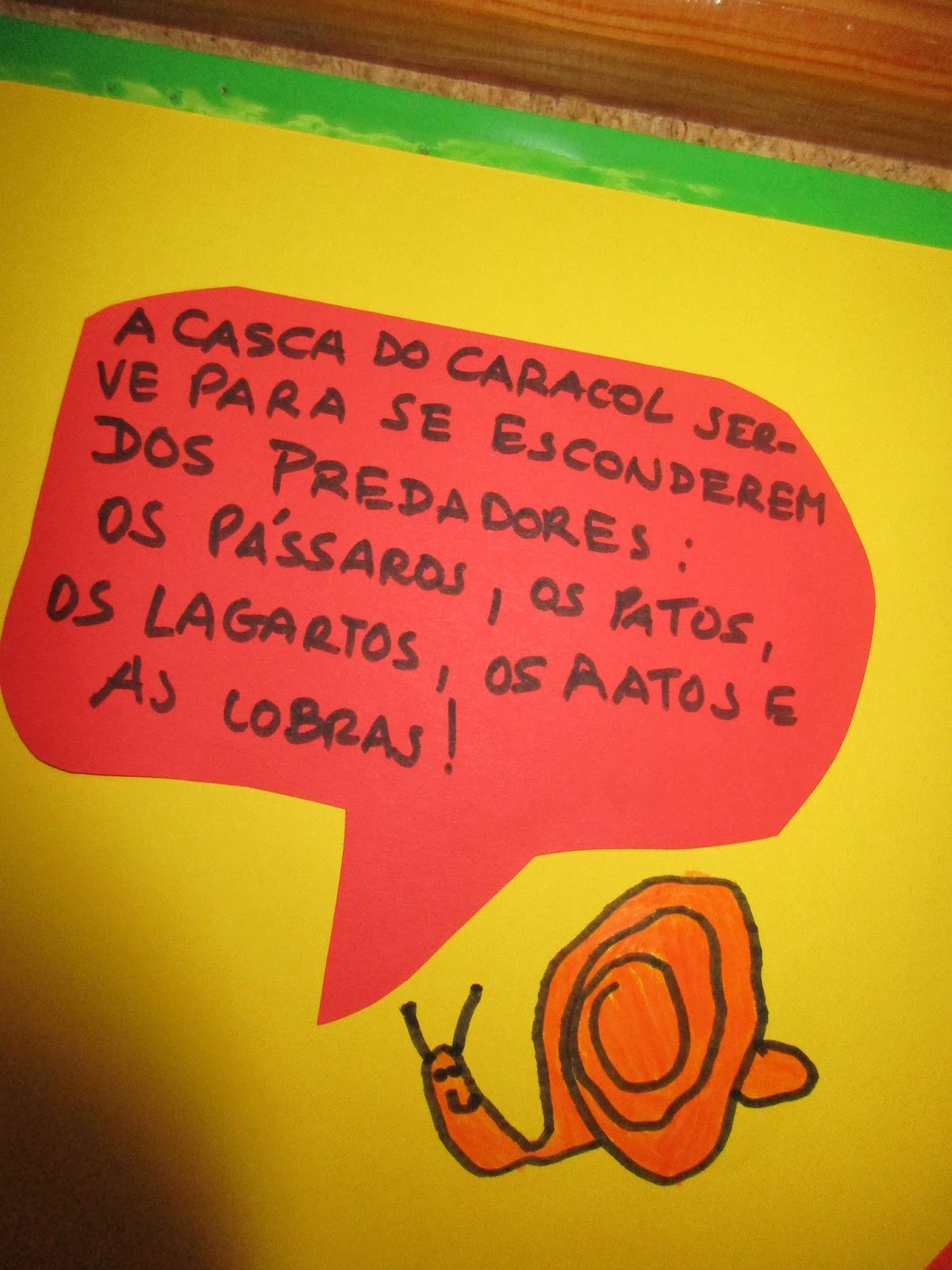 E descobrimos os caracóis no JI de Taveiro Publicada por Unknown em abril 25, 2016 Obter link Facebook X Pinterest Email Outras aplicações Nestes dias de chuva descobrimos que o recreio estava cheio de caracóis... A Camila desenhou um caracol muito bonito! A seguir todos quiseram desenhar e saíram obras de arte...Quanto aos caracóis, nunca tiveram tanta atenção. Comentários